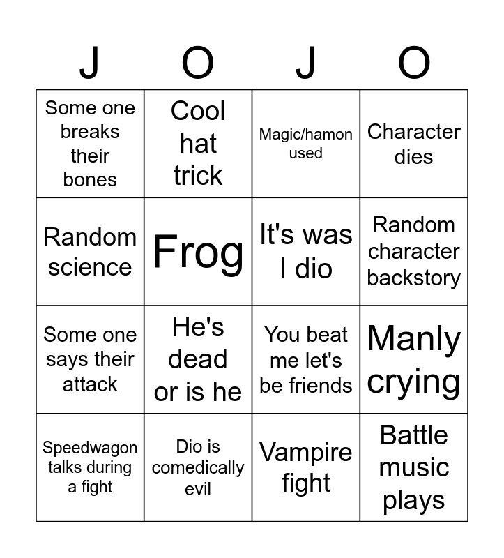 This bingo card has 16 words: Dio is comedically evil, Manly crying, Magic/hamon used, Some one breaks their bones, Some one says their attack, Cool hat trick, You beat me let's be friends, Vampire fight, Random science, Frog, Speedwagon talks during a fight, Character dies, He's dead or is he, Random character backstory, It's was I dio and Battle music plays.