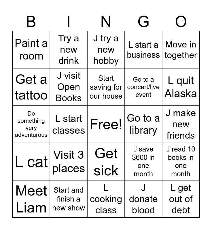 This bingo card has a free space and 24 words: Visit 3 places, Start and finish a new show, Start saving for our house, Meet Liam, Move in together, Paint a room, Get a tattoo, Try a new drink, Go to a library, Get sick, Go to a concert/live event, Do something very adventurous, J save $600 in one month, J read 10 books in one month, J visit Open Books, J donate blood, J make new friends, J try a new hobby, L quit Alaska, L start classes, L get out of debt, L cat, L start a business and L cooking class.