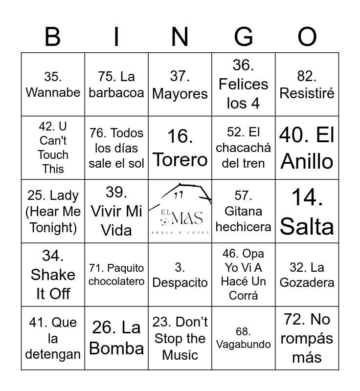 This bingo card has a free space and 90 words: 1. All my loving, 2. El toro y la luna, 3. Despacito, 4. Shape of You, 5. Gloria, 6. Macarena, 7. YMCA, 8. La Bamba, 9. Volare, 10. I Will Survive, 11. A Dios le pido, 12. Ave María, 13. Zapatillas, 14. Salta, 15. Chiquilla, 16. Torero, 17. Rivers of Babylon, 18. Freed From Desire, 19. Rhythm of the Night, 20. Saturday Night, 21. Barbie Girl, 22. Boom, Boom, Boom, Boom!, 23. Don’t Stop the Music, 24. Bad Romance, 25. Lady (Hear Me Tonight), 26. La Bomba, 27. Danza Kuduro, 28. Waka Waka, 29. Aserejé, 30. Bailando, 31. La Bicicleta, 32. La Gozadera, 33. Happy, 34. Shake It Off, 35. Wannabe, 36. Felices los 4, 37. Mayores, 38. Uptown Funk, 39. Vivir Mi Vida, 40. El Anillo, 41. Que la detengan, 42. U Can't Touch This, 43. Bamboleo, 44. Ai Se Eu Te Pego, 45. Despechá, 46. Opa Yo Vi A Hacé Un Corrá, 47. Te Quiero Más, 48. Cómo Te Atreves a Volver, 49. Flying Free, 50. Yo quiero bailar, 51. Escándalo, 52. El chacachá del tren, 53. Darte un beso, 54. Por la raja de tu falda, 55. Vagabundo, 56. Coti X coti, 57. Gitana hechicera, 58. Sarandonga, 59. Hay que venir al sur, 60. Tractor amarillo, 61. Tacones rojos, 62. Fiesta, 63. Bulería, 64. Solo se vive una vez, 65. Vivir así es morir de amor, 66. Escándalo, 67. The final countdown, 68. Vagabundo, 69. Chiquilla, 70. Follow the leader, 71. Paquito chocolatero, 72. No rompás más, 73. Maria Caipirinha, 74. Mari Carmen, 75. La barbacoa, 76. Todos los días sale el sol, 77. Cotton eye Joe, 78. Thriller, 79. My sharona, 80. Maquillaje, 81. A quén le importa, 82. Resistiré, 83. Antes muerta que sencilla, 84. Buscando en el baúl de los recuerdos, 85. Paquito chocolatero, 86. Fiesta pagana, 87. Fiesta (Pedro Capó), 88. Opá yo vi a hacé un corrá, 89. Sweet Caroline and 90. Yo no te pido la luna.