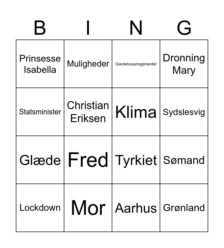 This bingo card has 98 words: 2024, Familie, Færøerne, Grønland, Gud bevare Danmark, Kronprins Christian, Kronprinsen, Europa, Nytårshilsen, Børn, Integration, Terror, Krig, Mor, Ukraine, Dronning Mary, Glæde, Vaccine, Arbejde, Dronning Margrethe, Flygtninge, Frankrig, Fællesskab, Generationer, Kongeskibet, Muligheder, Politiet, Ansvar, Soldat/Soldater, Josephine, Klimaforandringer, Sydslesvig, Vincent, Omstilling, Tyrkiet, Livgarden, Prinsesse Isabella, Royal Run, Aarhus, Børnebørn, Børsen, Fred, Klima, København, OL i Paris, Omsorg, Prins Joachim, Samfundssind, Sundhedspersonale, EU, Facebook, Israel, Jonas Vingegaard, Abdicere, Fodbold, Instagram, Lockdown, Norge, Rusland, Udsatte, Bror, Erhvervsliv, Folkesundhed, Kongehus/Kongehuset, Mobning, Palæstina, Putin, Restriktioner, Sverige, USA, Gardehusarregimentet, Grøn omstilling, Asyl, Fattigdom, Ferie, Innovation, Kommunalvalg, Landsholdet, Pension, Sømand, Tiktok, Christian Eriksen, Cykling, Donald Trump, Bitcoin, Danskhed, Elbiler, Forskelligheder, Ligestilling, Medmennesker, Bornholm, Grev Felix, Kong Charles, Landbruget, MeToo, Snapchat, Statsminister and Tilbageblik.