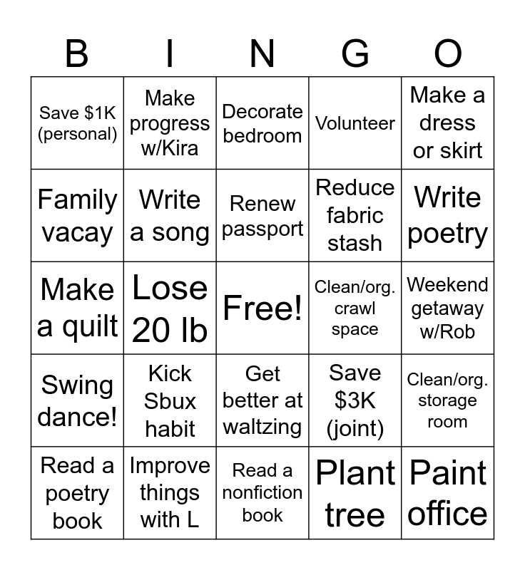 This bingo card has a free space and 24 words: Kick Sbux habit, Improve things with L, Renew passport, Read a poetry book, Make a dress or skirt, Save $1K (personal), Family vacay, Make progress w/Kira, Clean/org. crawl space, Get better at waltzing, Reduce fabric stash, Make a quilt, Save $3K (joint), Clean/org. storage room, Write a song, Plant tree, Weekend getaway w/Rob, Decorate bedroom, Write poetry, Lose 20 lb, Paint office, Swing dance!, Volunteer and Read a nonfiction book.