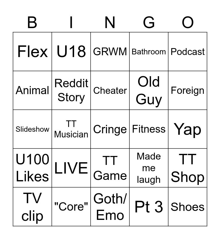 This bingo card has a free space and 24 words: LIVE, "Core", Cheater, TV clip, Podcast, Flex, Animal, U18, Fitness, TT Game, Old Guy, Slideshow, Made me laugh, TT Shop, Reddit Story, Pt 3, Yap, GRWM, Foreign, TT Musician, Shoes, U100 Likes, Bathroom and Goth/ Emo.