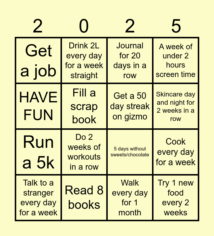 This bingo card has 16 words: Read 8 books, Cook every day for a week, Journal for 20 days in a row, Get a job, Run a 5k, Drink 2L every day for a week straight, 5 days without sweets/chocolate, Walk every day for 1 month, HAVE FUN, Fill a scrap book, Talk to a stranger every day for a week, A week of under 2 hours screen time, Do 2 weeks of workouts in a row, Skincare day and night for 2 weeks in a row, Get a 50 day streak on gizmo and Try 1 new food every 2 weeks.