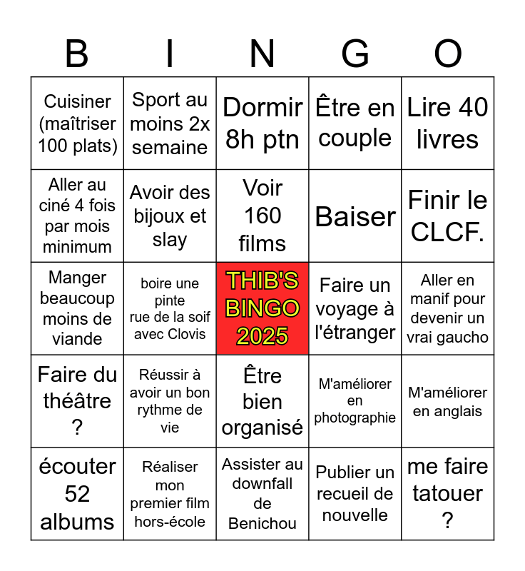 This bingo card has a free space and 24 words: Réussir à avoir un bon rythme de vie, Réaliser mon premier film hors-école, Voir 160 films, écouter 52 albums, Lire 40 livres, Cuisiner (maîtriser 100 plats), Aller au ciné 4 fois par mois minimum, Sport au moins 2x semaine, Faire un voyage à l'étranger, Être bien organisé, Baiser, Manger beaucoup moins de viande, M'améliorer en photographie, M'améliorer en anglais, Avoir des bijoux et slay, Publier un recueil de nouvelle, Aller en manif pour devenir un vrai gaucho, Dormir 8h ptn, Finir le CLCF., boire une pinte rue de la soif avec Clovis, me faire tatouer ?, Faire du théâtre ?, Être en couple and Assister au downfall de Benichou.