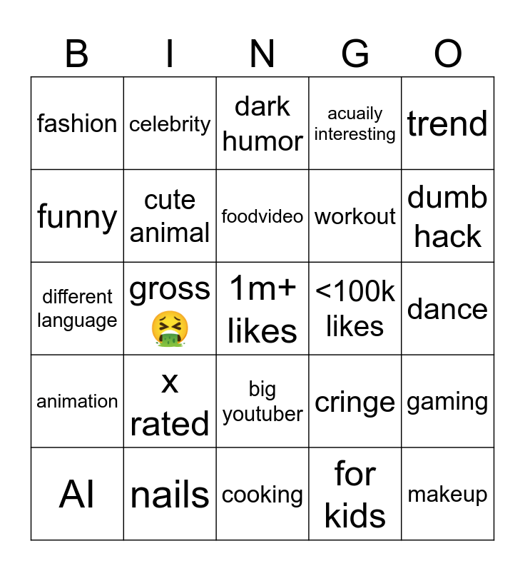 This bingo card has a free space and 24 words: x rated, nails, foodvideo, AI, trend, fashion, funny, celebrity, <100k likes, big youtuber, workout, different language, cringe, gaming, cute animal, for kids, dance, dark humor, dumb hack, gross🤮, makeup, animation, acuaily interesting and cooking.