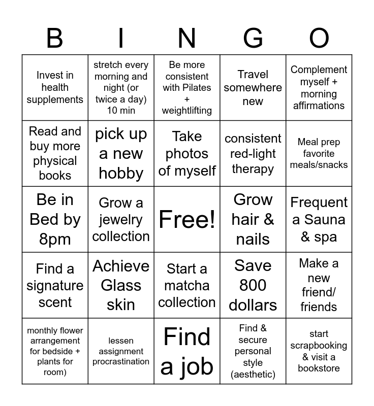 This bingo card has a free space and 24 words: Achieve Glass skin, lessen assignment procrastination, Take photos of myself, monthly flower arrangement for bedside + plants for room), Complement myself + morning affirmations, Invest in health supplements, Read and buy more physical books, stretch every morning and night (or twice a day) 10 min, Grow hair & nails, Start a matcha collection, consistent red-light therapy, Be in Bed by 8pm, Save 800 dollars, Make a new friend/ friends, pick up a new hobby, Find & secure personal style (aesthetic), Frequent a Sauna & spa, Be more consistent with Pilates + weightlifting, Meal prep favorite meals/snacks, Grow a jewelry collection, start scrapbooking & visit a bookstore, Find a signature scent, Travel somewhere new and Find a job.