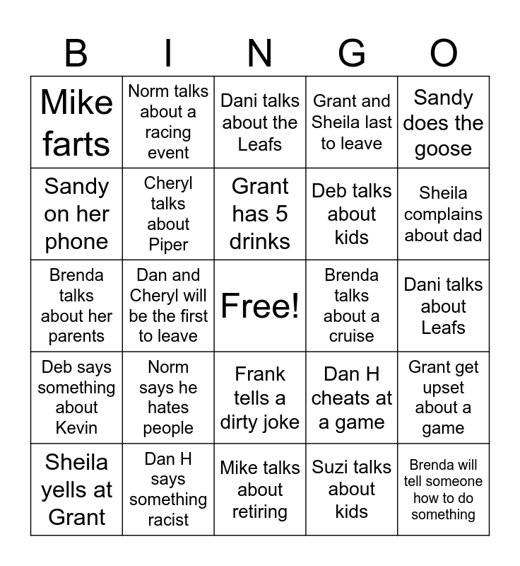 This bingo card has a free space and 24 words: Norm says he hates people, Dan H says something racist, Grant has 5 drinks, Sheila yells at Grant, Sandy does the goose, Mike farts, Sandy on her phone, Norm talks about a racing event, Brenda talks about a cruise, Frank tells a dirty joke, Deb talks about kids, Brenda talks about her parents, Dan H cheats at a game, Grant get upset about a game, Cheryl talks about Piper, Suzi talks about kids, Dani talks about Leafs, Dani talks about the Leafs, Sheila complains about dad, Dan and Cheryl will be the first to leave, Brenda will tell someone how to do something, Deb says something about Kevin, Grant and Sheila last to leave and Mike talks about retiring.