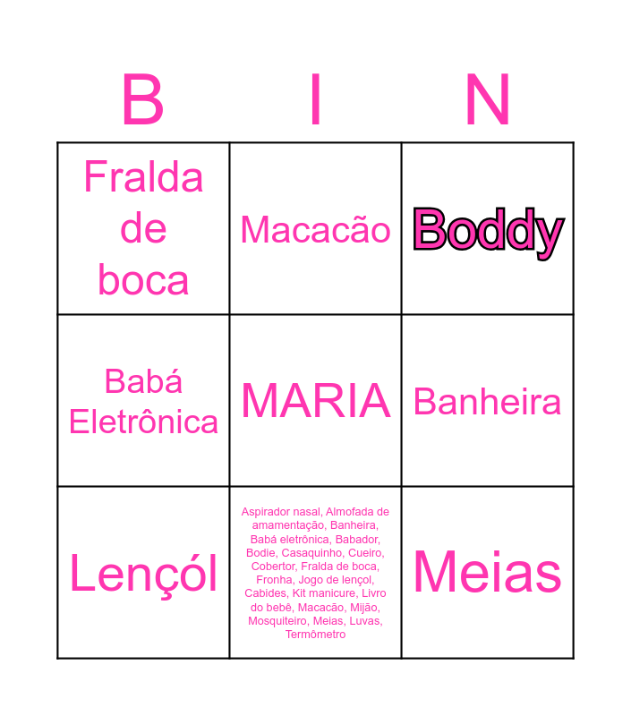This bingo card has a free space and 9 words: Lençól, Boddy, Macacão, Babá Eletrônica, Fralda de boca, Banheira, Meias, Luvas and Aspirador nasal, Almofada de amamentação, Banheira, Babá eletrônica, Babador, Bodie, Casaquinho, Cueiro, Cobertor, Fralda de boca, Fronha, Jogo de lençol, Cabides, Kit manicure, Livro do bebê, Macacão, Mijão, Mosquiteiro, Meias, Luvas, Termômetro.