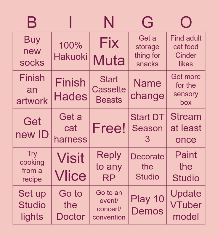 This bingo card has a free space and 24 words: Visit Vlice, Go to the Doctor, Start Cassette Beasts, Set up Studio lights, Find adult cat food Cinder likes, Buy new socks, Finish an artwork, 100% Hakuoki, Start DT Season 3, Reply to any RP, Name change, Get new ID, Decorate the Studio, Paint the Studio, Finish Hades, Play 10 Demos, Stream at least once, Fix Muta, Get more for the sensory box, Get a cat harness, Update VTuber model, Try cooking from a recipe, Get a storage thing for snacks and Go to an event/ concert/ convention.