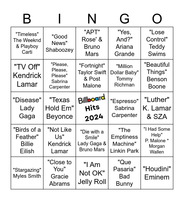 This bingo card has a free space and 37 words: "Squabble Up" Kendrick Lamar, "Love Somebody" Morgan Wallen, "A Bar Song (Typsy)" Shaboozey, "Please, Please, Please" Sabrina Carpenter, "I Had Some Help" P. Malone * Morgan Wallen, "Not Like Us" Kendrick Lamar, "Fortnight" Taylor Swift & Post Malone, "Too Sweet" Hozier, "Lose Control" Teddy Swims, "We Can't Be Friends" Ariana Grande, "Texas Hold Em" Beyonce, "Yes, And?" Ariana Grande, "Houdini" Eminem, "Luther" K. Lamar & SZA, "TV Off" Kendrick Lamar, "Birds of a Feather" Billie Eilish, "That's So True" Gracie Abrams, "APT" Rose' & Bruno Mars, "Die with a Smile" Lady Gaga & Bruno Mars, "Espresso" Sabrina Carpenter, "Timeless" The Weeknd & Playboy Carti, "Beautiful Things" Benson Boone, "Stargazing" Myles Smith, "I Am Not OK" Jelly Roll, "Pink Pony Club" Chappell Roan, "Que Pasaria" Bad Bunny, "Good News" Shaboozey, "Popular" (Wicked) Ariana Grande, "Liar" Jelly Roll, "Dancing in the Flames" The Weeknd, "Think I'm in Love with You" Chris Stapleton, "Close to You" Gracie Abrams, "Disease" Lady Gaga, "The Tortured Poets Department" Taylor Swift, "The Emptiness Machine" Linkin Park, "Million Dollar Baby" Tommy Richman and "Good Luck, Babe!" Chappell Roan.