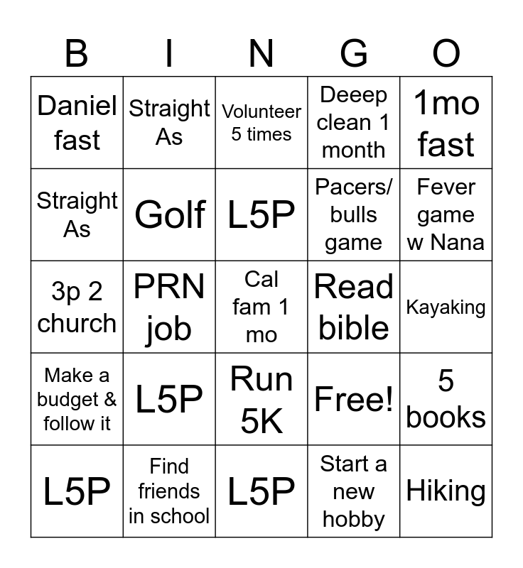 This bingo card has 25 words: L5P, L5P, L5P, L5P, 1mo fast, Daniel fast, Straight As, Straight As, Read bible, Run 5K, Pacers/ bulls game, 3p 2 church, Free!, 5 books, Golf, Hiking, Kayaking, Volunteer 5 times, Fever game w Nana, PRN job, Cal fam 1 mo, Find friends in school, Make a budget & follow it, Deeep clean 1 month and Start a new hobby.