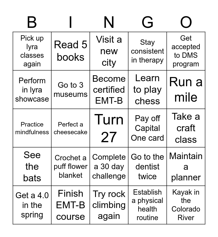 This bingo card has a free space and 24 words: Crochet a puff flower blanket, Finish EMT-B course, Become certified EMT-B, Get a 4.0 in the spring, Get accepted to DMS program, Pick up lyra classes again, Perform in lyra showcase, Read 5 books, Pay off Capital One card, Complete a 30 day challenge, Learn to play chess, Practice mindfulness, Go to the dentist twice, Maintain a planner, Go to 3 museums, Establish a physical health routine, Take a craft class, Visit a new city, Run a mile, Perfect a cheesecake, Kayak in the Colorado River, See the bats, Stay consistent in therapy and Try rock climbing again.