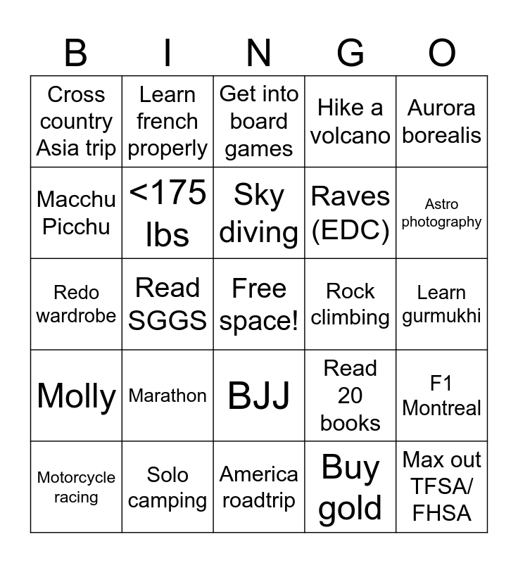 This bingo card has a free space and 24 words: Marathon, Solo camping, Sky diving, Motorcycle racing, Aurora borealis, Cross country Asia trip, Macchu Picchu, Learn french properly, Rock climbing, BJJ, Raves (EDC), Redo wardrobe, Read 20 books, F1 Montreal, <175 lbs, Buy gold, Learn gurmukhi, Get into board games, Astro photography, Read SGGS, Max out TFSA/ FHSA, Molly, Hike a volcano and America roadtrip.