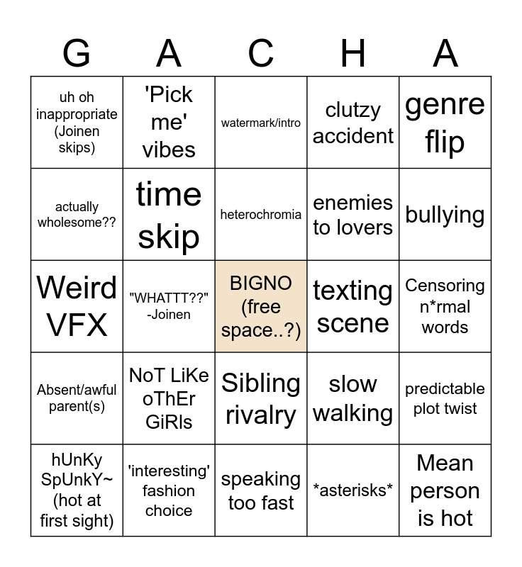 This bingo card has a free space and 39 words: Love shape, spelking, DEATH!!, time skip, hUnKy SpUnkY~ (hot at first sight), Sibling rivalry, heterochromia, abrupt ending, genre flip, Absent/awful parent(s), "WHATTT??" -Joinen, clutzy accident, Mean person is hot, Censoring n*rmal words, texting scene, NoT LiKe oThEr GiRls, flashback/backstory, uh oh inappropriate (Joinen skips), bad boy x good girl, slow walking, actually wholesome??, speaking too fast, enemies to lovers, bullying, horns/animal ears (for no reason), unnecessarily slow actions/speaking, 'To Be Continued...', car accident (or equivalent), Important character ONLY wears black, 'Pick me' vibes, gang/mafia, generic/weird choice of music, watermark/intro, 'interesting' fashion choice, *asterisks*, alpha/werewolf, predictable plot twist, Weird VFX and scars/tattoos.