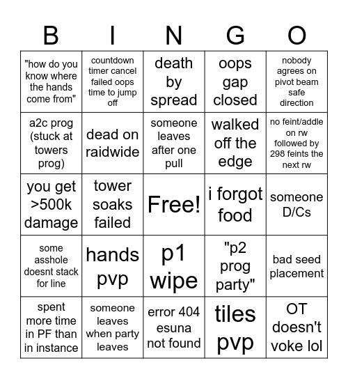 This bingo card has a free space and 24 words: hands pvp, someone leaves when party leaves, someone leaves after one pull, spent more time in PF than in instance, nobody agrees on pivot beam safe direction, "how do you know where the hands come from", a2c prog (stuck at towers prog), countdown timer cancel failed oops time to jump off, i forgot food, p1 wipe, walked off the edge, you get >500k damage, "p2 prog party", bad seed placement, dead on raidwide, tiles pvp, someone D/Cs, death by spread, no feint/addle on rw followed by 298 feints the next rw, tower soaks failed, OT doesn't voke lol, some asshole doesnt stack for line, oops gap closed and error 404 esuna not found.