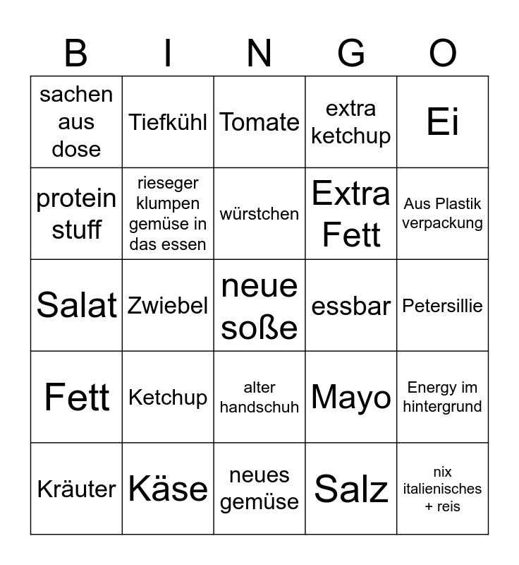 This bingo card has a free space and 24 words: Ketchup, Käse, würstchen, Kräuter, Ei, sachen aus dose, protein stuff, Tiefkühl, essbar, alter handschuh, Extra Fett, Salat, Mayo, Energy im hintergrund, rieseger klumpen gemüse in das essen, Salz, Petersillie, Tomate, Aus Plastik verpackung, Zwiebel, nix italienisches + reis, Fett, extra ketchup and neues gemüse.