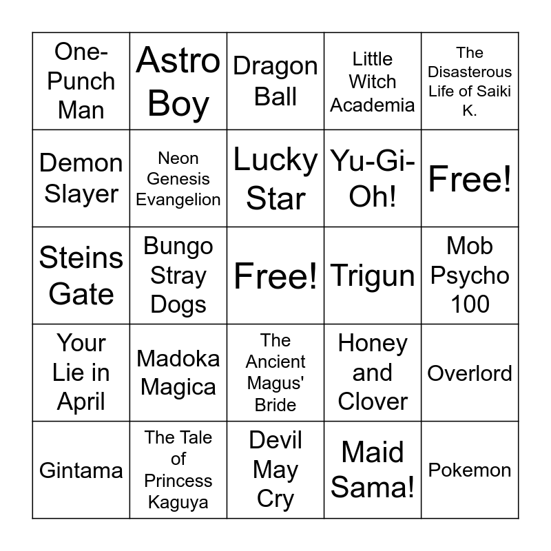 This bingo card has a free space and 84 words: Cowboy Bebop, One Piece, Dragon Ball, Death Note, Fullmetal Alchemist, Naruto, Attack on Titan, Hunter x Hunter, Sailor Moon, Berserk, Bleach, Ghost in the Shell, Neon Genesis Evangelion, Trigun, Sword Art Online, One-Punch Man, Gintama, Demon Slayer, Rurouni Kenshin, JoJo's Bizarre Adventure, My Hero Academia, Yu-Gi-Oh!, Pokemon, Jujutsu Kaisen, Bungo Stray Dogs, Fairy Tail, Kill La Kill, Gurren Lagann, Mobile Suit Gundam, Digimon, Madoka Magica, Hellsing, Bakugan, Steins Gate, Soul Eater, Code Geass, Devil May Cry, Ouran High School Host Club, Free!, Your Lie in April, Durarara!!, Spice and Wolf, Fruits Basket, Angel Beats!, InuYasha, Princess Tutu, Astro Boy, Kimba The White Lion, Akira, Chobits, Assassination Classroom, Honey and Clover, Little Witch Academia, Fate/Zero, That Time I Got Reincarnated as a Slime, K-On!, The Tale of Princess Kaguya, Lucky Star, Redline, Mob Psycho 100, Spirited Away, Devilman Crybaby, The Devil is a Part-Timer!, Delicious in Dungeon, SpyxFamily, Komi Can't Communicate, Beastars, Blue Eye Samurai, The Disasterous Life of Saiki K., Castlevania, Overlord, BNA: Brand New Animal, Baki Hanma, My Dress-Up Darling, The Ancient Magus' Bride, Maid Sama!, Cardcaptor Sakura, Revolutionary Girl Utena, Chainsaw Man, Food Wars!, Black Clover, Yuri on Ice, The Seven Deadly Sins and Danganronpa.
