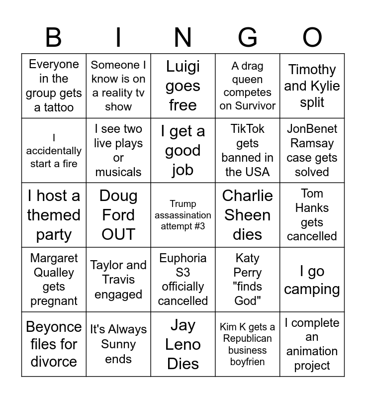 This bingo card has 25 words: Taylor and Travis engaged, Jay Leno Dies, I get a good job, Beyonce files for divorce, Timothy and Kylie split, Everyone in the group gets a tattoo, I accidentally start a fire, Someone I know is on a reality tv show, Charlie Sheen dies, Euphoria S3 officially cancelled, TikTok gets banned in the USA, I host a themed party, Katy Perry "finds God", I go camping, I see two live plays or musicals, I complete an animation project, Tom Hanks gets cancelled, Luigi goes free, JonBenet Ramsay case gets solved, Doug Ford OUT, Trump assassination attempt #3, It's Always Sunny ends, Margaret Qualley gets pregnant, A drag queen competes on Survivor and Kim K gets a Republican business boyfrien.