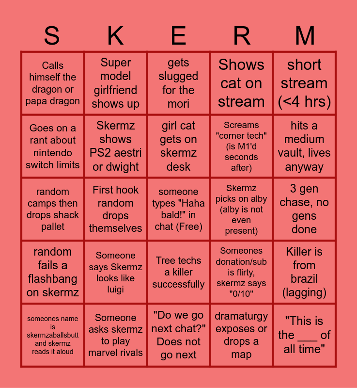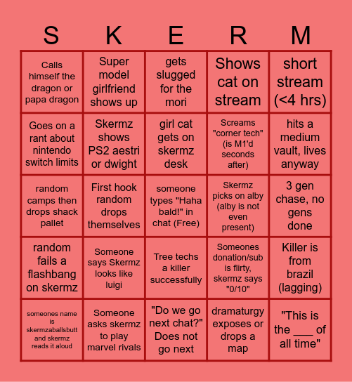 This bingo card has a free space and 24 words: Someone says Skermz looks like luigi, Someone asks skermz to play marvel rivals, girl cat gets on skermz desk, someones name is skermzaballsbutt and skermz reads it aloud, short stream (<4 hrs), Calls himself the dragon or papa dragon, Goes on a rant about nintendo switch limits, Super model girlfriend shows up, Skermz picks on alby (alby is not even present), Tree techs a killer successfully, Screams "corner tech"(is M1'd seconds after), random camps then drops shack pallet, Someones donation/sub is flirty, skermz says "0/10", Killer is from brazil (lagging), Skermz shows PS2 aestri or dwight, dramaturgy exposes or drops a map, 3 gen chase, no gens done, gets slugged for the mori, hits a medium vault, lives anyway, First hook random drops themselves, "This is the ___ of all time", random fails a flashbang on skermz, Shows cat on stream and "Do we go next chat?" Does not go next.