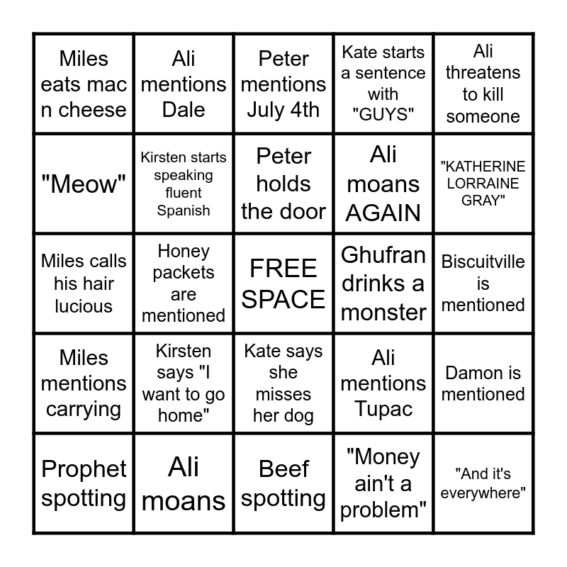 This bingo card has a free space and 24 words: Kirsten says "I want to go home", Ali moans, Peter holds the door, Prophet spotting, Ali threatens to kill someone, Miles eats mac n cheese, "Meow", Ali mentions Dale, Ghufran drinks a monster, Kate says she misses her dog, Ali moans AGAIN, Miles calls his hair lucious, Ali mentions Tupac, Damon is mentioned, Kirsten starts speaking fluent Spanish, "Money ain't a problem", Biscuitville is mentioned, Peter mentions July 4th, "KATHERINE LORRAINE GRAY", Honey packets are mentioned, "And it's everywhere", Miles mentions carrying, Kate starts a sentence with "GUYS" and Beef spotting.