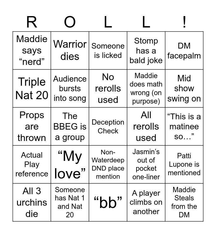 This bingo card has a free space and 47 words: Maddie Obtains a Wallet, Maddie Steals from the DM, Rocks Fall, “bb”, “My love”, Guest drinks pickle juice, Warrior dies, Kiss!, Triple Nat 20, Triple Nat 1, Audience bursts into song, Stomp has a bald joke, Patti Lupone is mentioned, Jasmin’s out of pocket one-liner, DM threatens TPK, Diego “polishes” his weapon, No rerolls used, All rerolls used, Someone wants to DM reroll, DM facepalm, The BBEG is a group, A player climbs on another, Maddie says “nerd”, Maddie does math wrong (on purpose), Jasmin rolls under 9 3x in a row, Mid show swing on, All 3 urchins die, All 3 urchins live, Non-Waterdeep DND place mention, Actual Play reference, NPC name is an guest, NPC name is guest’s PC, Stomp steps into for NPC impression, A pun everyone laughs at, Cassidy has a tummy ache, Someone has Nat 1 and Nat 20, “This is a matinee so…”, Old white man name, Players forget to add a hat, Romantic (sub)plot, Adoptive family subplot, Someone is licked, Props are thrown, British callout (probably at Will), Frat joke, Multiple hats on same person and No one yells “And Well Met!” on accident.