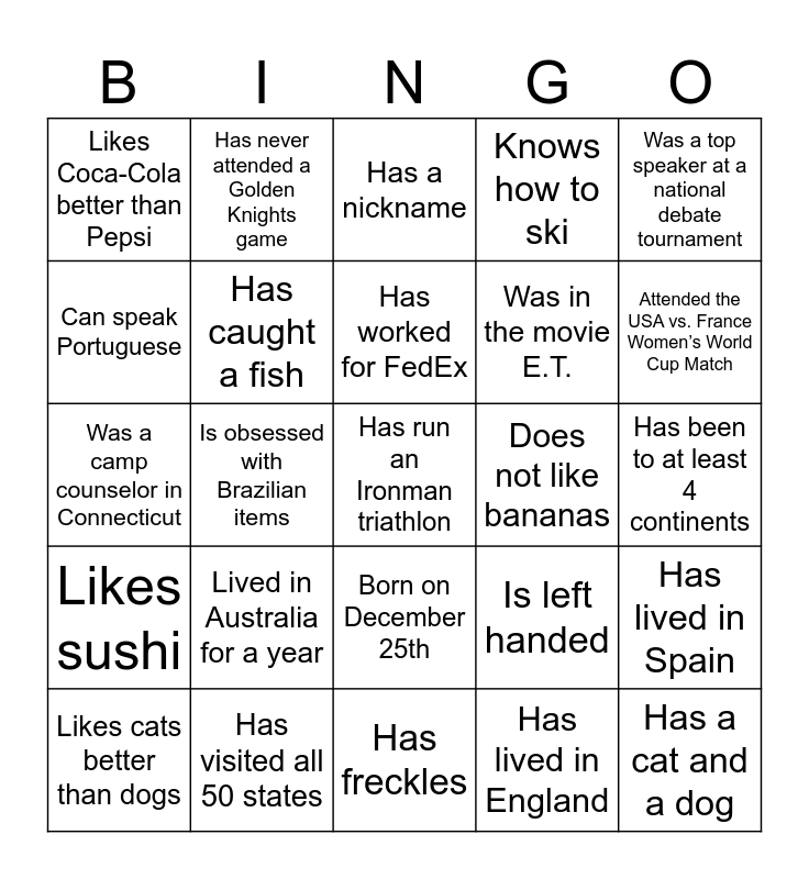 This bingo card has 57 words: Has been to an Aviators game, Likes cats better than dogs, Loves to watch all sports, Likes Coca-Cola better than Pepsi, Has freckles, Likes snakes, Has caught a fish, Has taken a picture with Megan Rapinoe, Was in the movie E.T., Was born on January 1st, Knows how to ski, Has traveled by train, Has younger siblings, Can speak 3 different languages, Has traveled to South America, Knows how to ice skate, Was a top speaker at a national debate tournament, Is obsessed with Brazilian items, Is a NASA Ambassador, Has run an Ironman triathlon, Does not like bananas, Can do a trick on a skateboard, Is left handed, Has a nickname, Has been to Australia, Has worked for FedEx, Has been hit by a car, Is currently attending UNLV, Attended the USA vs. France Women’s World Cup Match, Has had stitches, Dislikes chocolate, Has broken a bone, Has a black cat, Has never played Candy Crush, Has been to at least 4 continents, Can speak Portuguese, Grew up in San Francisco, Was a camp counselor in Connecticut, Worked at Baskin Robbins, Likes sushi, Has never attended a Golden Knights game, Born on December 25th, Has a cat and a dog, Has done the chicken dance, Has shot flaming arrows, Is a belly dancer, Lived in Australia for a year, Has visited all 50 states, Has eaten escargot, Has been skydiving, Has driven cross country, Has lived in England, Has visited 19 major league ballparks, Has been on a hot air balloon, Has been scuba diving, Has lived in Spain and Has the same birthday as you.
