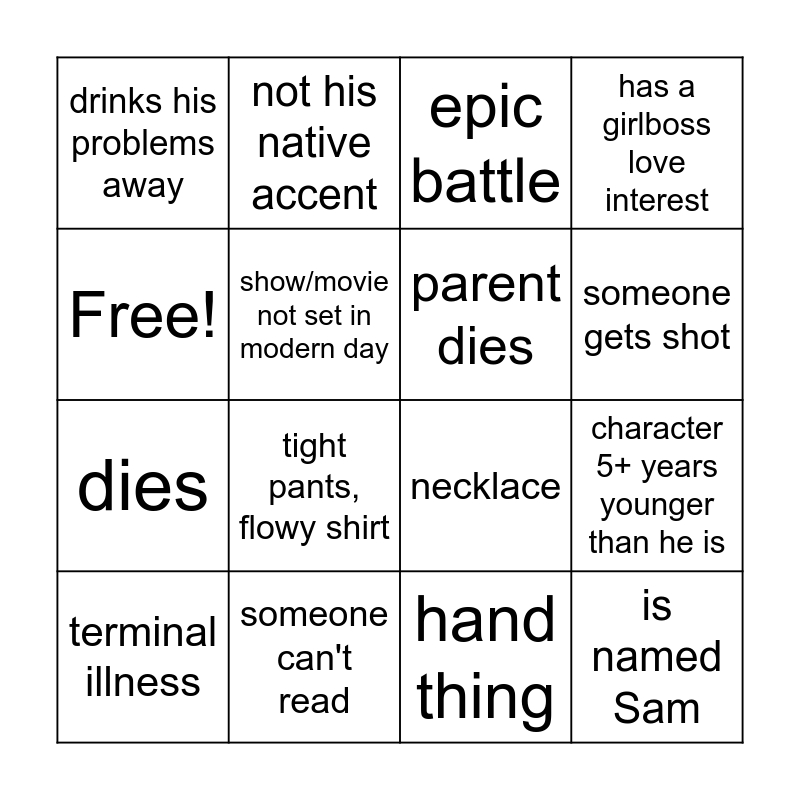 This bingo card has 16 words: someone can't read, character 5+ years younger than he is, epic battle, drinks his problems away, dies, not his native accent, necklace, hand thing, Free!, show/movie not set in modern day, terminal illness, has a girlboss love interest, tight pants, flowy shirt, someone gets shot, parent dies and is named Sam.