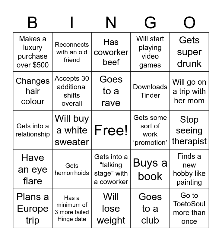 This bingo card has a free space and 24 words: Gets hemorrhoids, Has a minimum of 3 more failed Hinge date, Goes to a rave, Plans a Europe trip, Gets super drunk, Makes a luxury purchase over $500, Changes hair colour, Reconnects with an old friend, Gets some sort of work ‘promotion’, Gets into a “talking stage” with a coworker, Downloads Tinder, Gets into a relationship, Buys a book, Finds a new hobby like painting, Accepts 30 additional shifts overall, Goes to a club, Stop seeing therapist, Has coworker beef, Will go on a trip with her mom, Will buy a white sweater, Go to ToetoSoul more than once, Have an eye flare, Will start playing video games and Will lose weight.