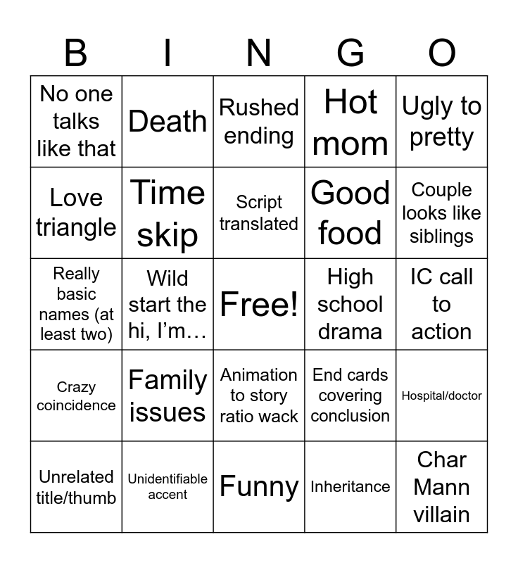 This bingo card has a free space and 24 words: Family issues, Unidentifiable accent, Script translated, Unrelated title/thumb, Ugly to pretty, No one talks like that, Love triangle, Death, High school drama, Animation to story ratio wack, Good food, Really basic names (at least two), End cards covering conclusion, Hospital/doctor, Time skip, Inheritance, IC call to action, Rushed ending, Couple looks like siblings, Wild start the hi, I’m…, Char Mann villain, Crazy coincidence, Hot mom and Funny.