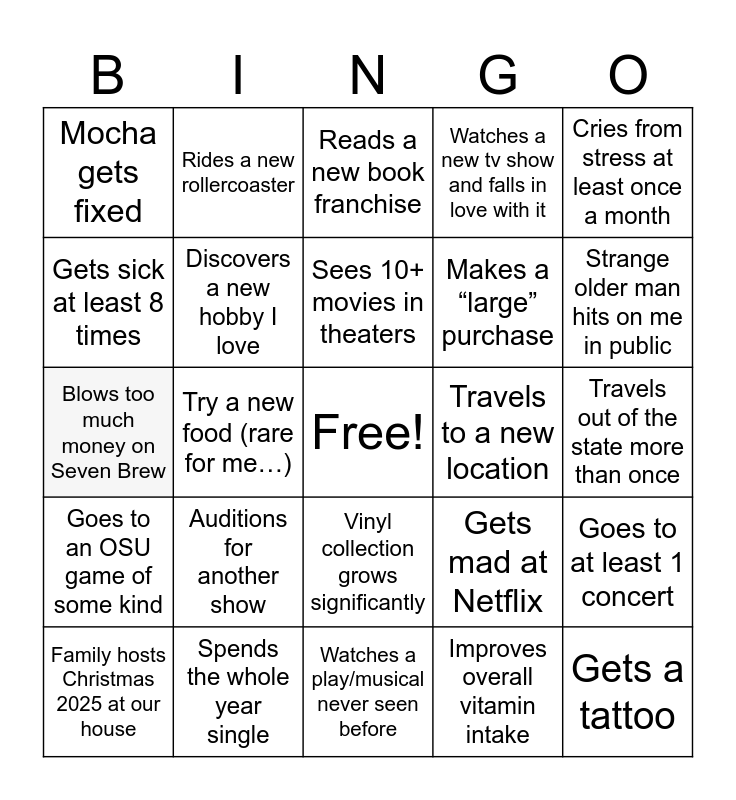 This bingo card has a free space and 24 words: Auditions for another show, Spends the whole year single, Sees 10+ movies in theaters, Family hosts Christmas 2025 at our house, Cries from stress at least once a month, Mocha gets fixed, Gets sick at least 8 times, Rides a new rollercoaster, Travels to a new location, Vinyl collection grows significantly, Makes a “large” purchase, Blows too much money on Seven Brew, Gets mad at Netflix, Goes to at least 1 concert, Discovers a new hobby I love, Improves overall vitamin intake, Travels out of the state more than once, Reads a new book franchise, Strange older man hits on me in public, Try a new food (rare for me…), Gets a tattoo, Goes to an OSU game of some kind, Watches a new tv show and falls in love with it and Watches a play/musical never seen before.