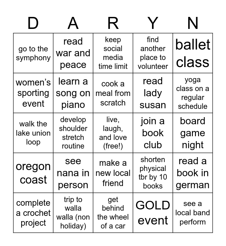 This bingo card has a free space and 24 words: see nana in person, trip to walla walla (non holiday), cook a meal from scratch, complete a crochet project, ballet class, go to the symphony, women’s sporting event, read war and peace, join a book club, make a new local friend, read lady susan, walk the lake union loop, shorten physical tbr by 10 books, read a book in german, learn a song on piano, GOLD event, board game night, keep social media time limit, yoga class on a regular schedule, develop shoulder stretch routine, see a local band perform, oregon coast, find another place to volunteer and get behind the wheel of a car.
