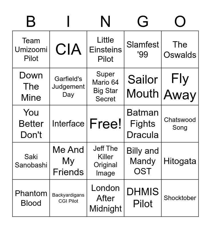 This bingo card has a free space and 24 words: Me And My Friends, Backyardigans CGI Pilot, Super Mario 64 Big Star Secret, Phantom Blood, The Oswalds, Team Umizoomi Pilot, Down The Mine, CIA, Batman Fights Dracula, Jeff The Killer Original Image, Sailor Mouth, You Better Don't, Billy and Mandy OST, Hitogata, Garfield's Judgement Day, DHMIS Pilot, Chatswood Song, Little Einsteins Pilot, Fly Away, Interface, Shocktober, Saki Sanobashi, Slamfest '99 and London After Midnight.