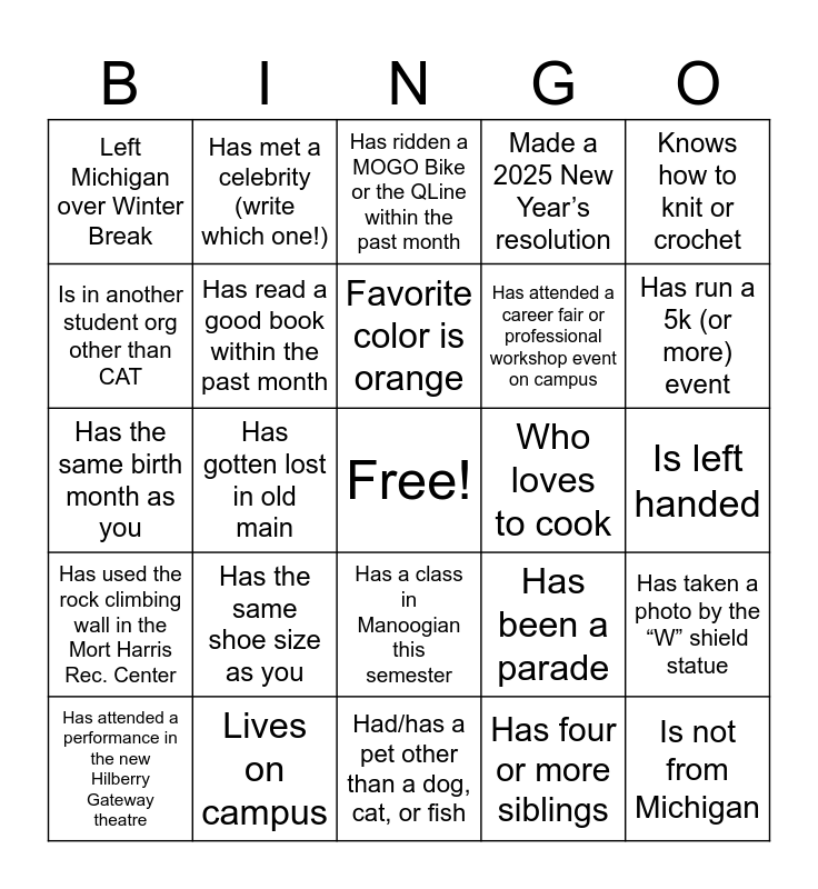 This bingo card has a free space and 24 words: Has the same shoe size as you, Lives on campus, Favorite color is orange, Has attended a performance in the new Hilberry Gateway theatre, Knows how to knit or crochet, Left Michigan over Winter Break, Is in another student org other than CAT, Has met a celebrity (write which one!), Who loves to cook, Has a class in Manoogian this semester, Has attended a career fair or professional workshop event on campus, Has the same birth month as you, Has been a parade, Has taken a photo by the “W” shield statue, Has read a good book within the past month, Has four or more siblings, Is left handed, Has ridden a MOGO Bike or the QLine within the past month, Has run a 5k (or more) event, Has gotten lost in old main, Is not from Michigan, Has used the rock climbing wall in the Mort Harris Rec. Center, Made a 2025 New Year’s resolution and Had/has a pet other than a dog, cat, or fish.