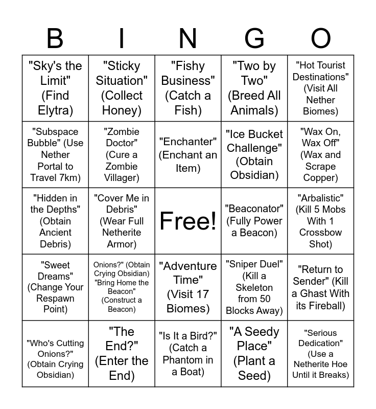 This bingo card has a free space and 24 words: "Who's Cutting Onions?" (Obtain Crying Obsidian), Onions?" (Obtain Crying Obsidian) "Bring Home the Beacon" (Construct a Beacon), "Enchanter" (Enchant an Item), "A Seedy Place" (Plant a Seed), "Hot Tourist Destinations" (Visit All Nether Biomes), "Sky's the Limit" (Find Elytra), "Sticky Situation" (Collect Honey), "Fishy Business" (Catch a Fish), "Beaconator" (Fully Power a Beacon), "Arbalistic" (Kill 5 Mobs With 1 Crossbow Shot), "Hidden in the Depths" (Obtain Ancient Debris), "Zombie Doctor" (Cure a Zombie Villager), "Sniper Duel" (Kill a Skeleton from 50 Blocks Away), "Return to Sender" (Kill a Ghast With its Fireball), "Subspace Bubble" (Use Nether Portal to Travel 7km), "The End?" (Enter the End), "Is It a Bird?" (Catch a Phantom in a Boat), "Two by Two" (Breed All Animals), "Wax On, Wax Off" (Wax and Scrape Copper), "Sweet Dreams" (Change Your Respawn Point), "Cover Me in Debris" (Wear Full Netherite Armor), "Adventure Time" (Visit 17 Biomes), "Ice Bucket Challenge" (Obtain Obsidian) and "Serious Dedication" (Use a Netherite Hoe Until it Breaks).