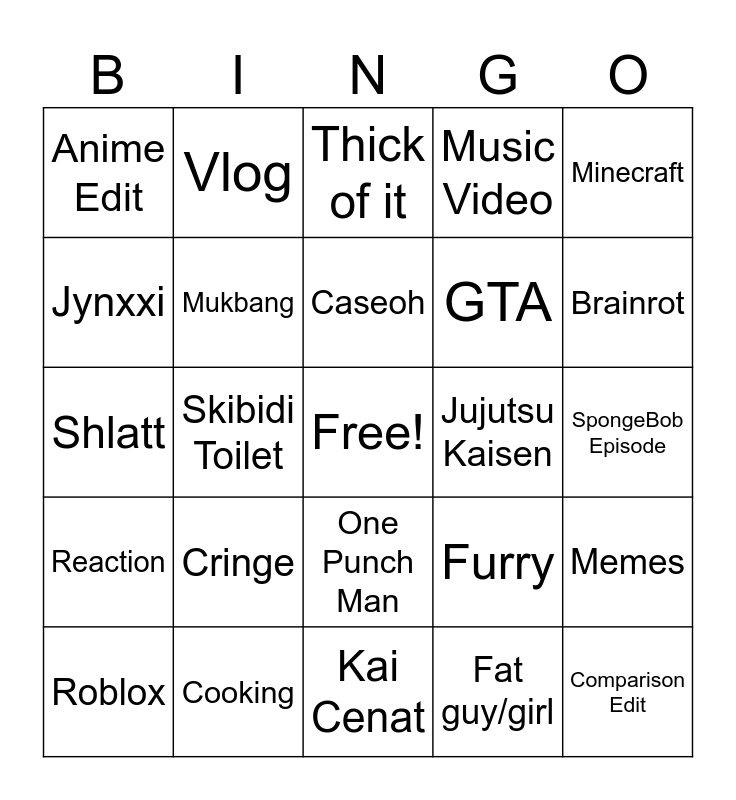 This bingo card has a free space and 24 words: Cringe, Cooking, Caseoh, Roblox, Minecraft, Anime Edit, Jynxxi, Vlog, Jujutsu Kaisen, One Punch Man, GTA, Shlatt, Furry, Memes, Mukbang, Fat guy/girl, SpongeBob Episode, Thick of it, Brainrot, Skibidi Toilet, Comparison Edit, Reaction, Music Video and Kai Cenat.