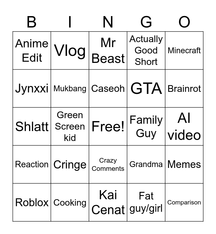This bingo card has a free space and 24 words: Cringe, Cooking, Caseoh, Roblox, Minecraft, Anime Edit, Jynxxi, Vlog, Family Guy, Crazy Comments, GTA, Shlatt, Grandma, Memes, Mukbang, Fat guy/girl, AI video, Mr Beast, Brainrot, Green Screen kid, Comparison, Reaction, Actually Good Short and Kai Cenat.