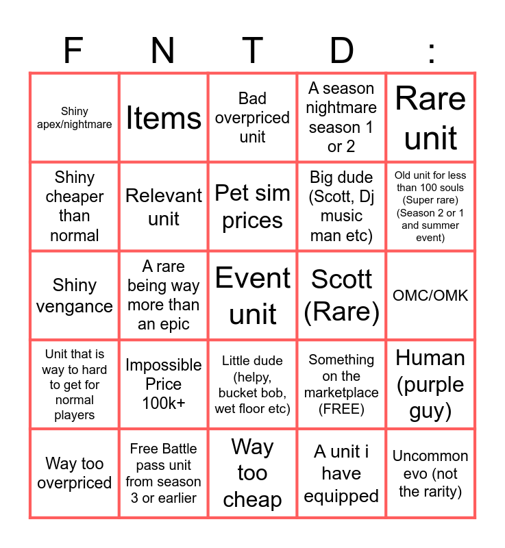 This bingo card has 25 words: Impossible Price 100k+, Way too cheap, Pet sim prices, Way too overpriced, Rare unit, Shiny apex/nightmare, Shiny cheaper than normal, Items, Scott (Rare), Little dude (helpy, bucket bob, wet floor etc), Big dude (Scott, Dj music man etc), Shiny vengance, Something on the marketplace (FREE), Human (purple guy), Relevant unit, Uncommon evo (not the rarity), OMC/OMK, Bad overpriced unit, Old unit for less than 100 souls (Super rare) (Season 2 or 1 and summer event), A rare being way more than an epic, Event unit, Free Battle pass unit from season 3 or earlier, Unit that is way to hard to get for normal players, A season nightmare season 1 or 2 and A unit i have equipped.