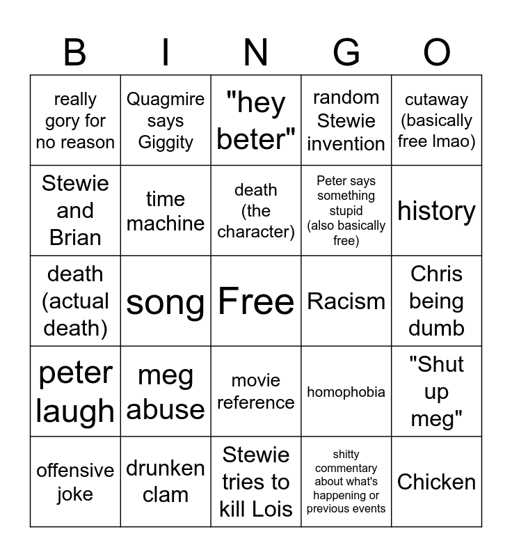 This bingo card has a free space and 24 words: meg abuse, drunken clam, death (the character), offensive joke, cutaway (basically free lmao), really gory for no reason, Stewie and Brian, Quagmire says Giggity, Racism, movie reference, Peter says something stupid (also basically free), death (actual death), homophobia, "Shut up meg", time machine, shitty commentary about what's happening or previous events, Chris being dumb, "hey beter", history, song, Chicken, peter laugh, random Stewie invention and Stewie tries to kill Lois.