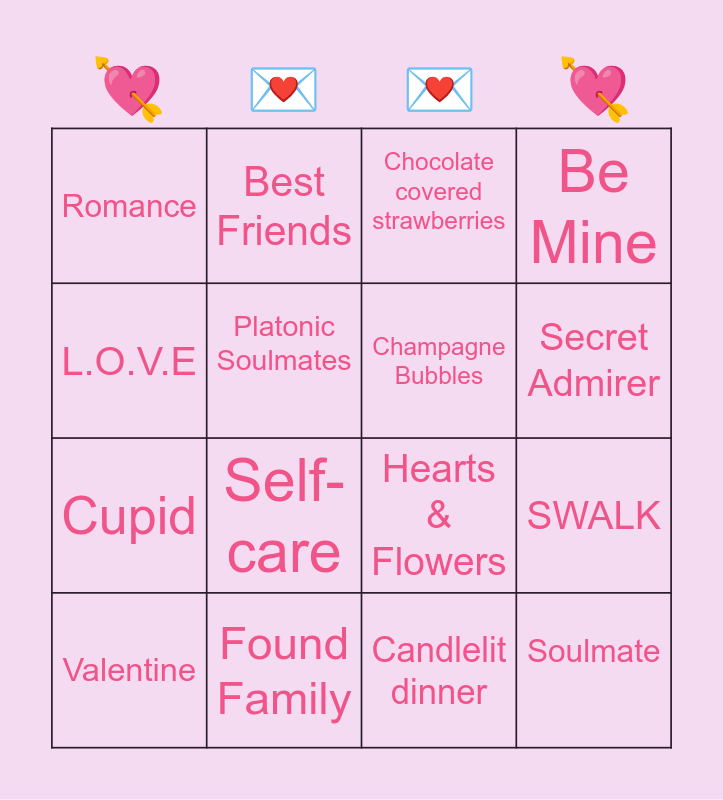 This bingo card has 16 words: Valentine, Found Family, Chocolate covered strawberries, Be Mine, L.O.V.E, Best Friends, Hearts & Flowers, SWALK, Romance, Platonic Soulmates, Candlelit dinner, Secret Admirer, Cupid, Self-care, Champagne Bubbles and Soulmate.