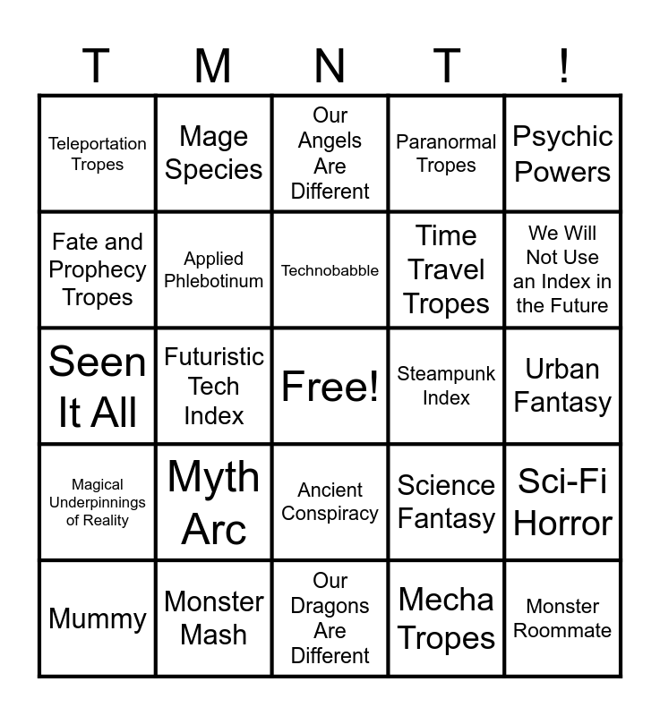 This bingo card has a free space and 92 words: All Myths Are True, Exaggerated Trope, Our Dragons Are Different, Our Fairies Are Different, Our Ghosts Are Different, Our Vampires Are Different, Our Werewolves Are Different, Mummy, Our Zombies Are Different, Alien Tropes, Our Gods Are Different, Robot Roll Call, Invisible to Normals, Time Travel Tropes, Sufficiently Advanced Alien, Psychic Powers, Our Angels Are Different, Our Demons Are Different, God, Eldritch Abomination, Precursors, Functional Magic, Crossover Cosmology, Monster of the Week, Myth Arc, Applied Phlebotinum, Mirror Universe, Dark World, Spirit World, Broken Masquerade, Monster Mash, Ancient Conspiracy, The Fair Folk, Body Snatcher, Mage Species, Ninja, Masquerade, Magic from Technology, Technobabble, Science Fantasy, Seen It All, Magical Underpinnings of Reality, Urban Fantasy, Pals with Jesus, Monster Roommate, Alternate History Tropes, Anatomy Arsenal, Apocalyptic Index, Autonomous and Artificial Appendage Index, Cyberpunk Tropes, Doppelgänger, Energy Weapon, Fairy Tale Tropes, Fantastic Flora, Fantastic Racism, Fantastic Sapient Species Tropes, Faster-Than-Light Index, Fate and Prophecy Tropes, Fictional Culture and Nation Tropes, Futuristic Tech Index, Humans Are Indexed, Index of Fictional Creatures, Lovecraftian Tropes, Magic and Powers, Make My Index Live!, Mecha Tropes, Military Science Fiction, Mind Control, One with the Index, Otherness Tropes, Otherworld Tropes, Our Clones Are Identical, Paranormal Tropes, Psychic Index, Ranged Energy Attack Tropes, Romanticism Versus Enlightenment, Sci-Fi Horror, Sealed Index in a Can, Superhero Tropes, Shapeshifting, Spacecraft, Steampunk Index, Teleportation Tropes, This Index Has a Mind of Its Own, This Index Will Live Forever, Transhuman, Tropes in Space, Tropes of the Soul, Tropes on Science and Unscience, Undead Index, We Will Not Use an Index in the Future and Wishing Tropes.