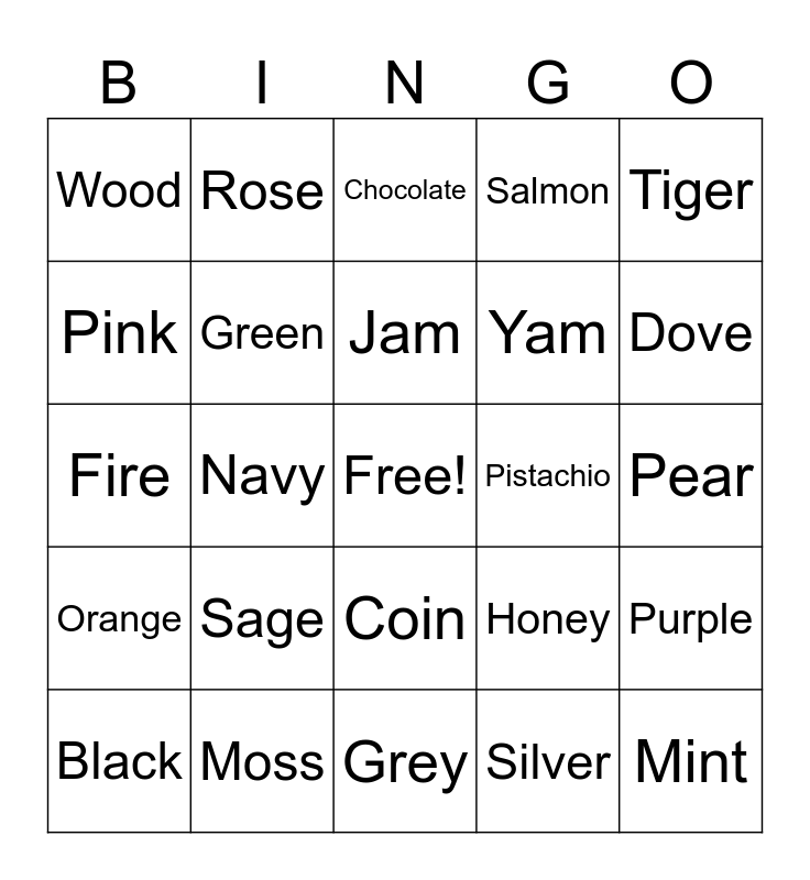 This bingo card has a free space and 29 words: Black, Blue, Navy, Brown, Wood, Chocolate, Green, Sage, Pistachio, Moss, Pear, Mint, Grey, Silver, Dove, Fog, Coin, Orange, Tiger, Fire, Honey, Carrot, Yam, Pink, Salmon, Rose, Purple, Jam and Red.