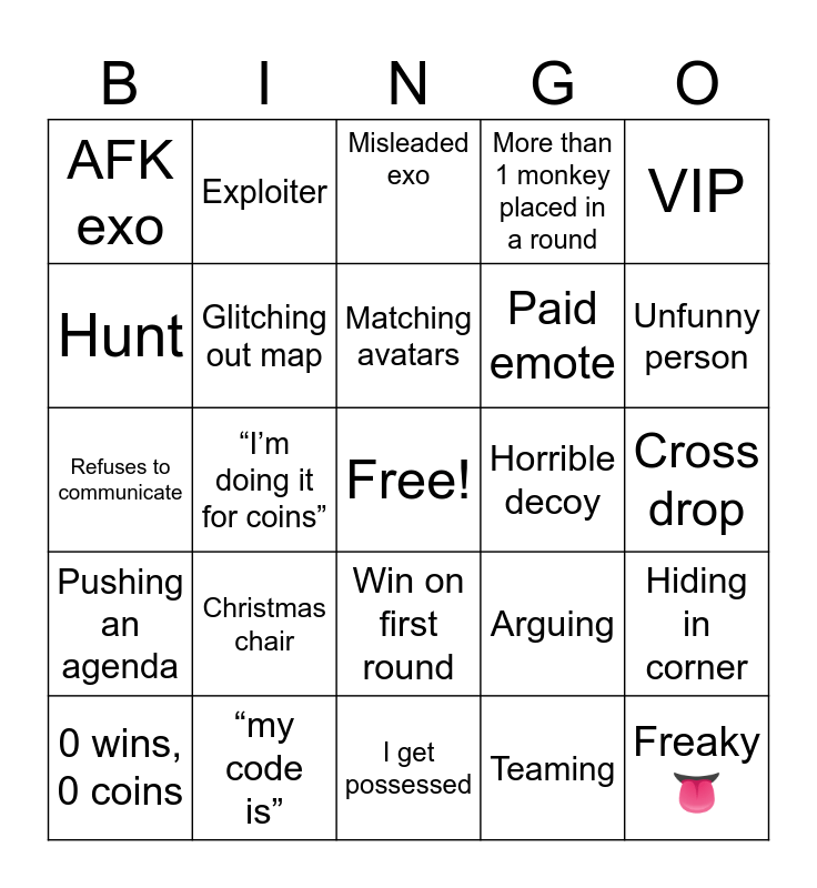 This bingo card has a free space and 24 words: Christmas chair, “my code is”, Matching avatars, 0 wins, 0 coins, VIP, AFK exo, Hunt, Exploiter, Horrible decoy, Win on first round, Paid emote, Refuses to communicate, Arguing, Hiding in corner, Glitching out map, Teaming, Cross drop, Misleaded exo, Unfunny person, “I’m doing it for coins”, Freaky 👅, Pushing an agenda, More than 1 monkey placed in a round and I get possessed.