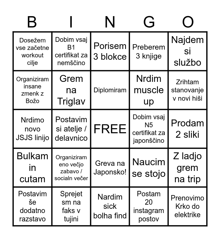 This bingo card has a free space and 24 words: Organiziram eno večjo zabavo / socialn večer, Sprejet sm na faks v tujini, Diplomiram, Postavim še dodatno razstavo, Najdem si službo, Dosežem vse začetne workout cilje, Organiziram insane zmenk z Božo, Dobim vsaj B1 certifikat za nemščino, Dobim vsaj N5 certifikat za japonščino, Greva na Japonsko!, Nrdim muscle up, Nrdimo novo JSJS linijo, Naucim se stojo, Z ladjo grem na trip, Grem na Triglav, Postam 20 instagram postov, Prodam 2 sliki, Porisem 3 blokce, Zrihtam stanovanje v novi hiši, Postavim si atelje / delavnico, Prenovimo Krko do elektrike, Bulkam in cutam, Preberem 3 knjige and Nardim sick bolha find.