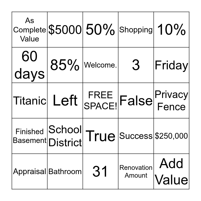 This bingo card has a free space and 24 words: School District, Bathroom, Welcome., Appraisal, 10%, As Complete Value, 60 days, $5000, False, True, 3, Titanic, Success, $250,000, 85%, Renovation Amount, Privacy Fence, 50%, Friday, Left, Add Value, Finished Basement, Shopping and 31.