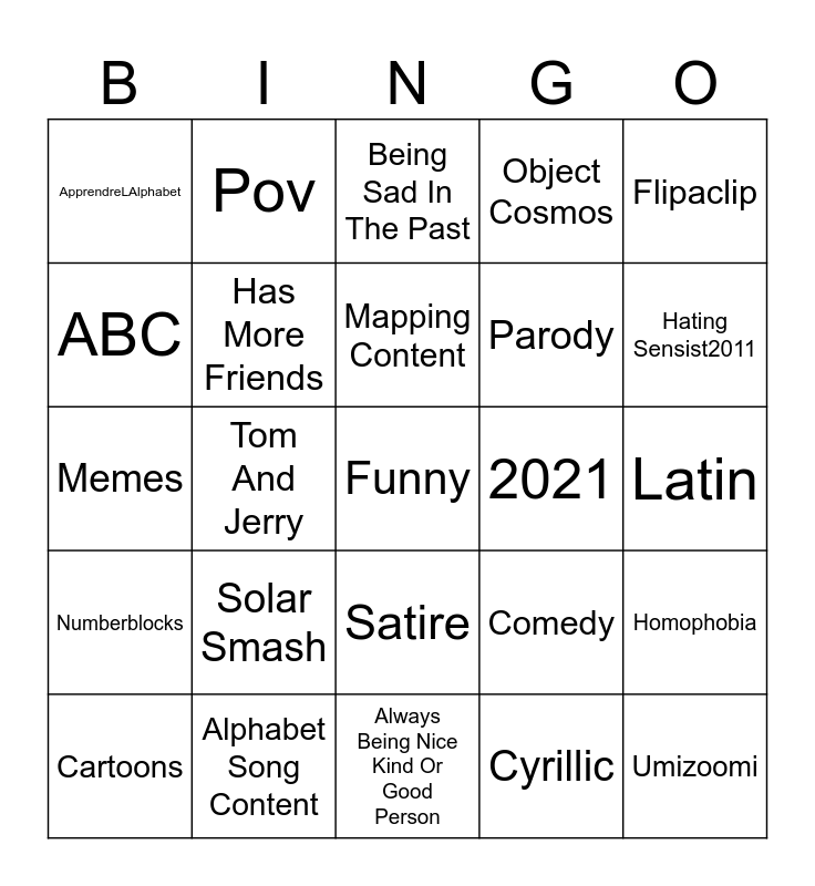 This bingo card has a free space and 24 words: Solar Smash, Alphabet Song Content, Mapping Content, Cartoons, Flipaclip, ApprendreLAlphabet, ABC, Pov, 2021, Satire, Parody, Memes, Comedy, Homophobia, Has More Friends, Cyrillic, Latin, Being Sad In The Past, Hating Sensist2011, Tom And Jerry, Umizoomi, Numberblocks, Object Cosmos and Always Being Nice Kind Or Good Person.