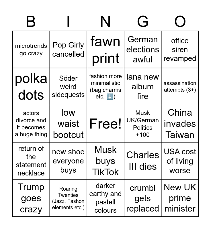 This bingo card has a free space and 24 words: new shoe everyone buys, Roaring Twenties (Jazz, Fashon elements etc.), fashion more minimalistic (bag charms etc. ⬇️), Trump goes crazy, office siren revamped, microtrends go crazy, polka dots, Pop Girly cancelled, Musk UK/German Politics +100, Musk buys TikTok, lana new album fire, actors divorce and it becomes a huge thing, Charles III dies, USA cost of living worse, Söder weird sidequests, crumbl gets replaced, China invades Taiwan, fawn print, assassination attempts (3+), low waist bootcut, New UK prime minister, return of the statement necklace, German elections awful and darker earthy and pastell colours.