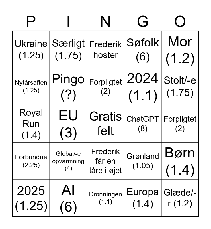 This bingo card has a free space and 44 words: Ensom/-hed (3), Glæde/-r (1.2), Frederik har briller på, 2025 (1.25), Frederik har grøndlansk merch på bordet, Europa (1.4), Frederik hoster, Frederik fumler med ordene, Mor (1.2), AI (6), Søfolk (6), ChatGPT (8), Frederik får en tåre i øjet, Global/-e opvarmning (4), Nærvær (6), Dronningen (1.1), Klima/-et (1.4), Royal Run (1.4), Gud Bevare Danmark (?), Stolt/-e (1.75), Særligt (1.75), Børsen (1.5), Juleaften (6), Ukraine (1.25), Christian (1.1), Forpligtet (2), Omsorg (2.5), Håb (1.4), Grønland (1.05), Forbundne (2.25), Ansvar (2), Børn (1.4), Kunstig Intelligens (3), Sømænd (5), EU (3), Tronskifte (4), OL/Olympiske Lege (1.4), Positiv/-e (4), Forpligtet (2), Nytårsaften (1.25), 2024 (1.1), Unge (1.2), Pingo (?) and Fællesskab/-et (2).
