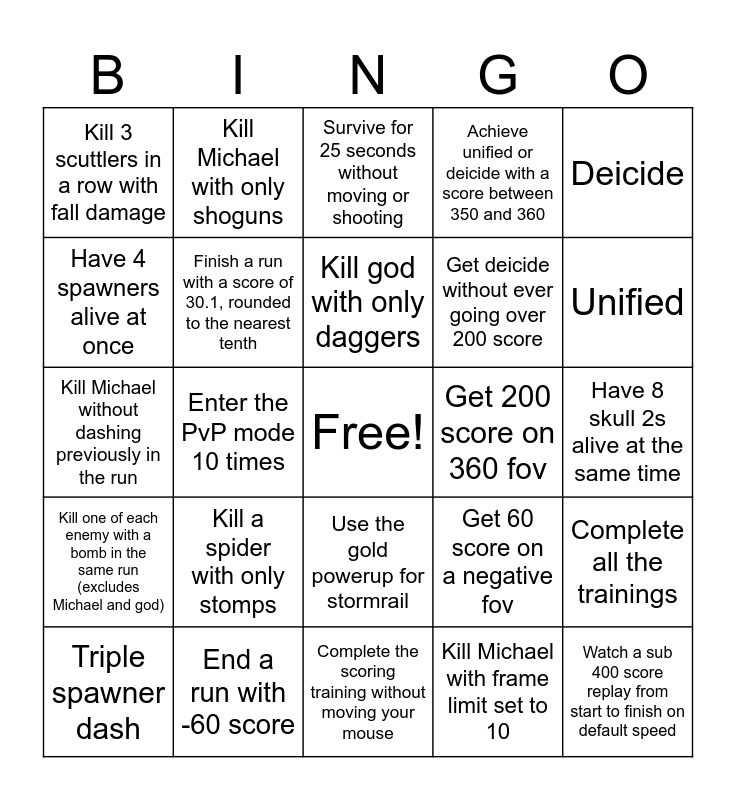 This bingo card has a free space and 24 words: Kill a spider with only stomps, End a run with -60 score, Kill god with only daggers, Triple spawner dash, Deicide, Kill 3 scuttlers in a row with fall damage, Have 4 spawners alive at once, Kill Michael with only shoguns, Get 200 score on 360 fov, Use the gold powerup for stormrail, Get deicide without ever going over 200 score, Kill Michael without dashing previously in the run, Get 60 score on a negative fov, Complete all the trainings, Finish a run with a score of 30.1, rounded to the nearest tenth, Kill Michael with frame limit set to 10, Have 8 skull 2s alive at the same time, Survive for 25 seconds without moving or shooting, Unified, Enter the PvP mode 10 times, Watch a sub 400 score replay from start to finish on default speed, Kill one of each enemy with a bomb in the same run (excludes Michael and god), Achieve unified or deicide with a score between 350 and 360 and Complete the scoring training without moving your mouse.