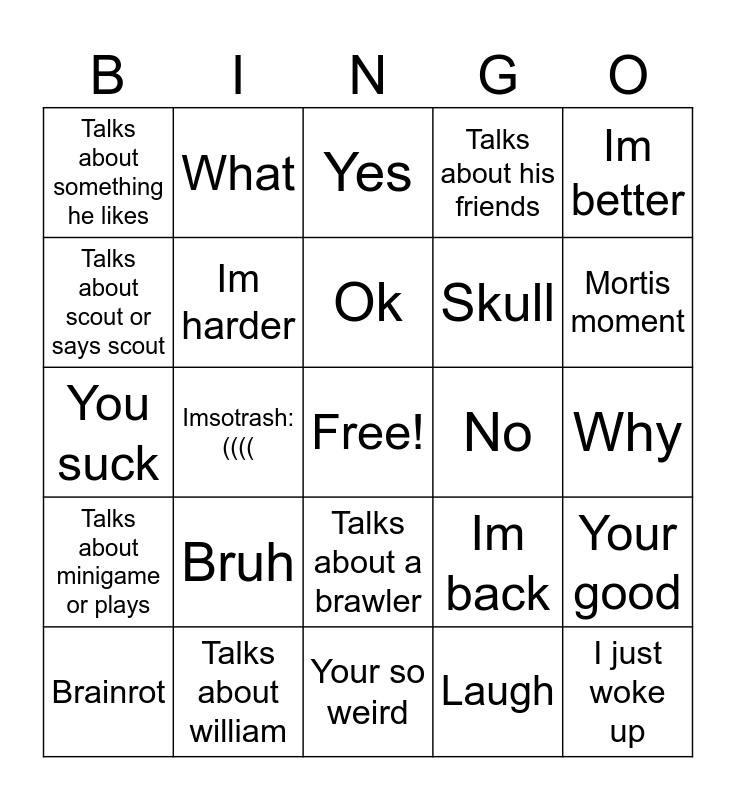 This bingo card has a free space and 24 words: Brainrot, Bruh, Ok, Laugh, Im better, Talks about something he likes, What, Yes, No, Why, You suck, Im harder, Im back, Your good, Talks about scout or says scout, Talks about william, Your so weird, Talks about his friends, Mortis moment, Talks about minigame or plays, Imsotrash:((((, Talks about a brawler, Skull and I just woke up.