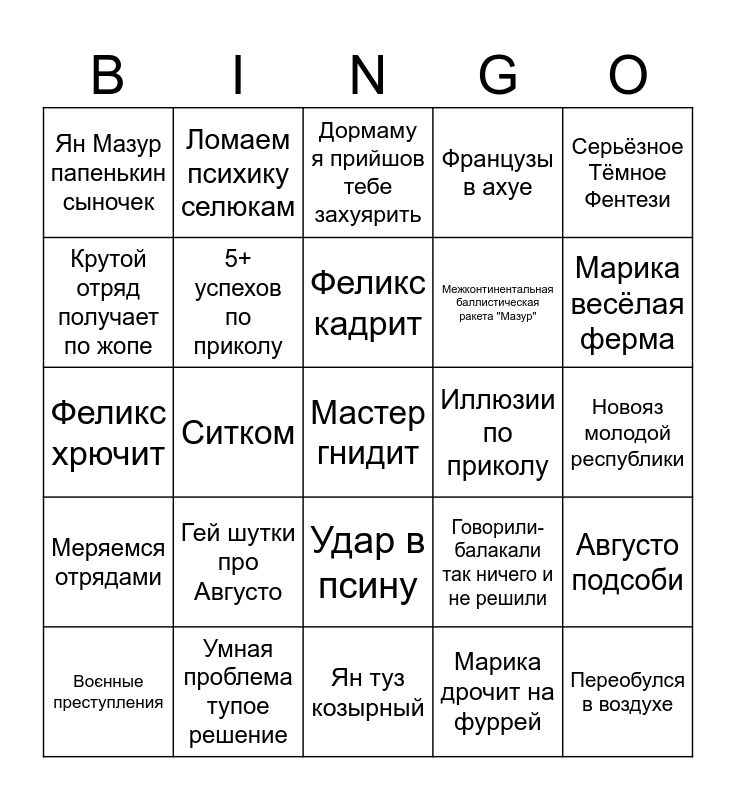 This bingo card has 25 words: Гей шутки про Августо, Ян туз козырный, Феликс кадрит, Воєнные преступления, Серьёзное Тёмное Фентези, Ян Мазур папенькин сыночек, Крутой отряд получает по жопе, Ломаем психику селюкам, Иллюзии по приколу, Удар в псину, Межконтинентальная баллистическая ракета "Мазур", Феликс хрючит, Говорили-балакали так ничего и не решили, Августо подсоби, 5+ успехов по приколу, Переобулся в воздухе, Новояз молодой республики, Дормаму я прийшов тебе захуярить, Марика весёлая ферма, Ситком, Мастер гнидит, Умная проблема тупое решение, Меряемся отрядами, Французы в ахуе and Марика дрочит на фуррей.